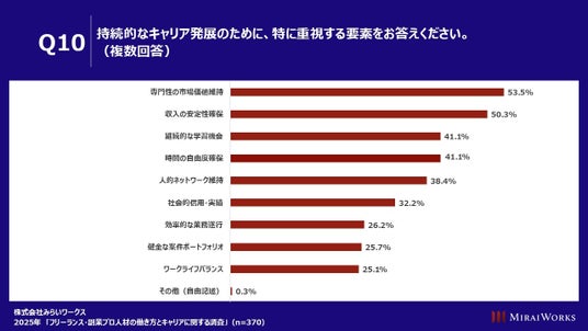 「持続的なキャリア発展のために、特に重視する要素をお答えください」(n=370)と質問したところ、「専門性の市場価値維持」53.5%、「収入の安定性確保」50.3%、「時間の自由度確保」41.1%、「継続的な学習機会」41.1%などがあげられた。その他、自由記載では、「健康の維持」があげられた。
