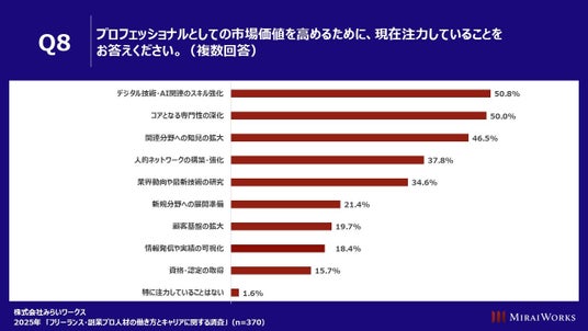 「プロフェッショナルとしての市場価値を高めるために、現在注力していることをお答えください」(n=370)と質問したところ、「デジタル技術・AI関連のスキル強化」50.8%、「コアとなる専門性の深化」50.0%、「関連分野への知見の拡大」46.5%などがあげられた。