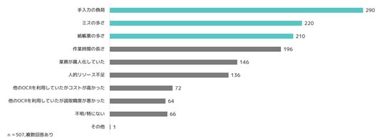 手作業による入力業務の負担や効率面の課題が、AI-OCR導入の大きな要因となっていることが分かります。