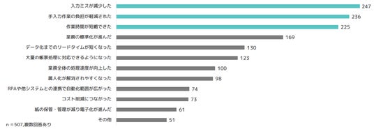 帳票入力業務の効率化や人的ミスの削減など、業務改善効果を感じている企業が多いことが分かります。