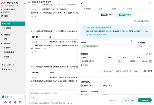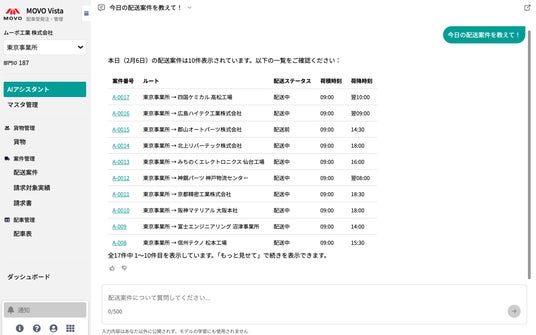 データの力で物流課題を解決する株式会社Hacobuは、配車受発注・管理サービス「MOVO Vista(ムーボ・ヴィスタ)」において、AIアシスタント機能の提供を開始しました。本機能により、チャットで質問するだけで、配送状況を素早く把握できます。画面を遷移して検索・集計する手間を減らし、物流現場の迅速な判断と対応を支援します。