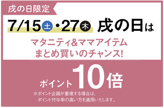 さらにマタニティの方に必要なインナーなどが、7月の戌の日限定でポイント10倍になる企画もご紹介します。