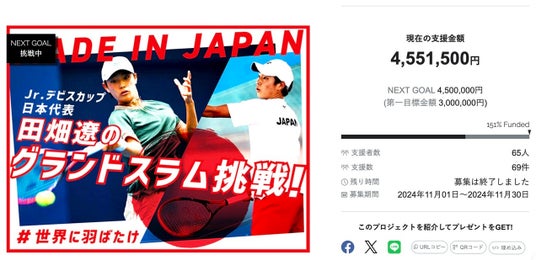 チーム・団体やアスリートを支援するスポーツ専門クラウドファンディングを展開するスポチュニティ株式会社(東京都中央区、以下スポチュニティ)は、Jr.デビスカップ日本代表 田畑遼選手のクラウドファンディングを実施し、支援金額が1st・2nd Goalを達成し、最終的に4,551,500円に達し終了しました。