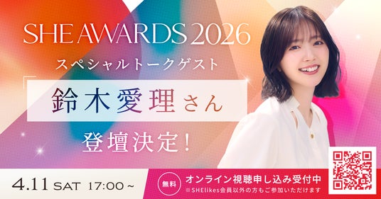 2026年4月11日(土)に開催する「SHE AWARDS 2026」(https://shelikes.jp/she-awards2026)のスペシャルトークゲストに、鈴木愛理さんが決定しました。CM撮影の裏側に加え、SHEアワードのテーマ「みんなで変わる、みんなと変わる。」に合わせて、アーティスト・俳優として幅広く活躍し、挑戦を続けてきた鈴木さんの変化や、これからの人生で挑戦していきたいことについてお話しいただきます。