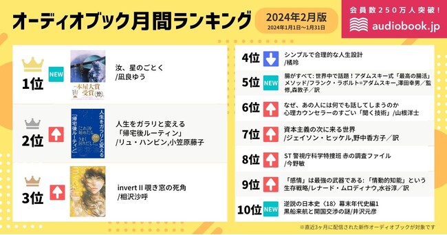 株式会社オトバンク( 本社:東京都文京区、代表取締役社長:久保田裕也、以下「オトバンク」)は、当社が運営する会員数が250万人超、オーディオブック書籍ラインナップ数No.1(※)の日本最大級のオーディオブック配信サービス「audiobook.jp」におけるオーディオブック月間ランキング2月付(2024/1/1~1/31)を発表します。