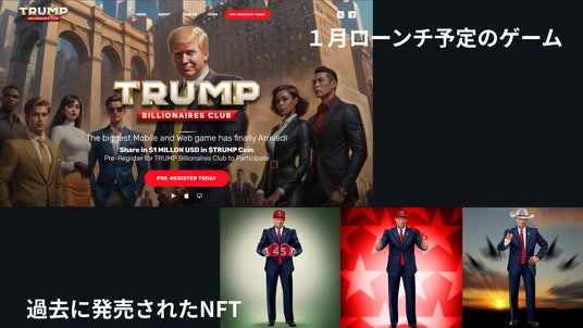 $TRUMPを発行する以前にも何度かNFTの販売が行われましたが、1月からは初のWeb3ゲーム「Trump Billionaires Club」のローンチが予定されています。事前登録者へはポイント数に応じてゲーム用のNFTが配布されており、アイテムの課金などにTRUMPが使用できると公式サイトには記載が行われています。