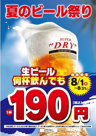 ステーキ宮の「夏のビール祭り」では、生ビール中ジョッキを通常1杯590円(税込)のところなんと!1杯190円(税込)で“何杯”でもご注文いただけます!