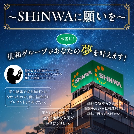 「~SHiNWAに願いを~」は、大阪府・兵庫県内に設置されている信和グループのロゴ看板を撮影し、自身の「夢」や「願いごと」をSNSで投稿していただく参加型企画です。期間中に投稿された内容の中から1名を選出し、信和ホールディングスがその夢を実際に実現します。