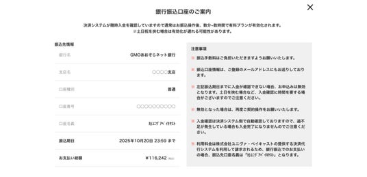 本アップデートでは、有料プランの利用料金を銀行振込でお支払いいただく際の振込先口座の有効期限が、従来の7日間以内から30日以内へ延長されます。これにより、事業者が余裕をもった支払いスケジュールで有料プランを利用開始できるようになり、契約手続きの利便性が向上します。
