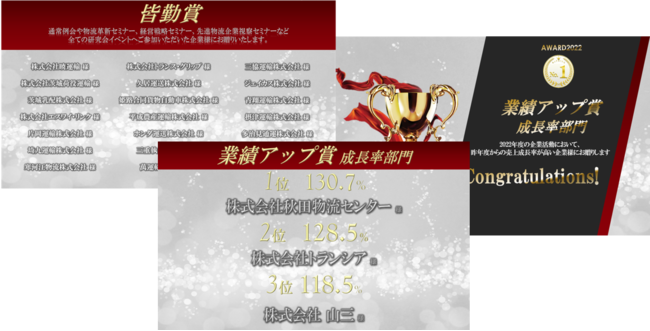 研究会イベント皆勤賞・社員数アップ賞・業績率アップ賞・売り上げアップ賞の4つの軸で表彰しています。