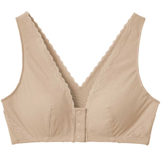 全体にやわらかなレースを使用し、気になる背中部分はソフトなパワーネットの裏打ちでお肉を自然に押さえ、背筋も意識できます。着脱のしやすさと美しいバストラインはもちろん、毎日身に着けるものだからこそ、スナップボタンが直接肌に触れないなど着心地のやさしさにもこだわりました。