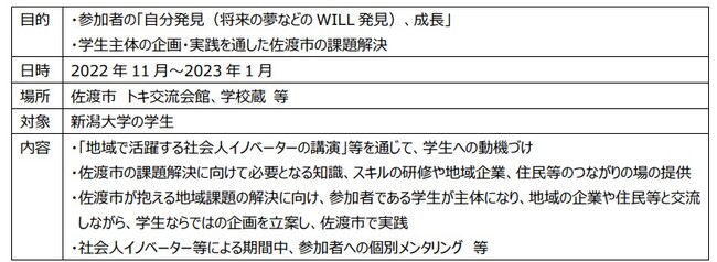佐渡市の持続的な発展に向けた地域循環型社会の実現を目指すため、佐渡市においてワークショップ等を開催するなど、佐渡市の企業や住民、学生、社会人イノベーターが集い、交流し、学び合う佐渡市の課題解決プログラムを実施していきます。今回、本プログラムのスタートとして、新潟大学の学生を中心とした「学生エンパワーメントと佐渡市の課題解決を両立する佐渡イノベーション・プログラム(トライアル)」を実施します。