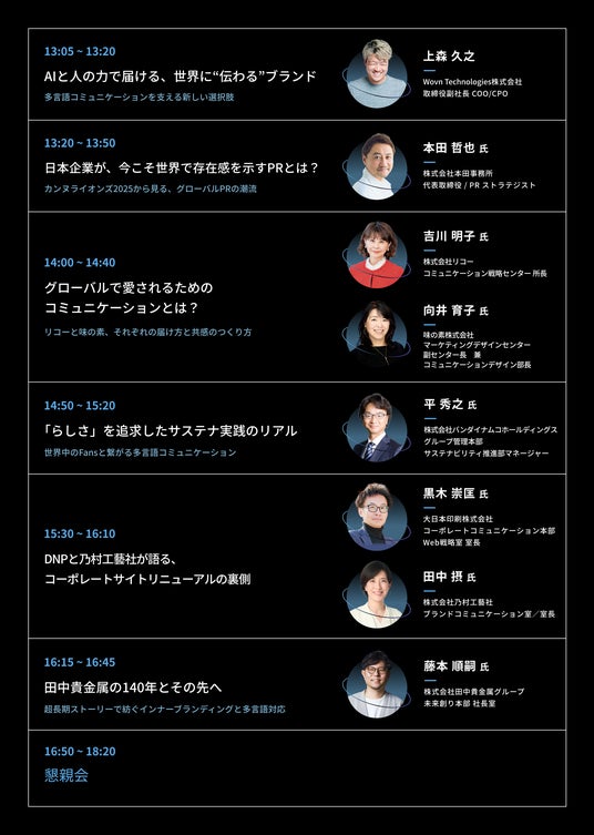 本カンファレンスでは、グローバルで一貫したブランドを構築するために本社広報・マーケティングに求められる役割や、多言語 AI テクノロジーの活用事例について、各社の実践事例をもとにご紹介します。