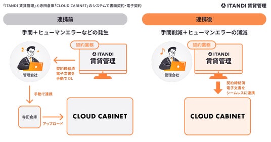 このたび、「ITANDI 賃貸管理」申込システム 電子契約オプションと「CLOUD CABINET」を連携し(以下「本連携」)コスモスイニシアに提供開始しました。本連携により、「ITANDI 賃貸管理」で契約締結が完了した電子文書と契約書情報が、寺田倉庫の「CLOUD CABINET」上へシームレスに反映されます。従来の手動でのダウンロード/データ連携作業を不要とし、業務負荷やヒューマンエラーを抑えながら、書面契約と電子契約の一括管理が可能となります。