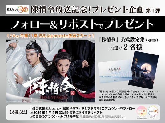 BSJapanextの韓国ドラマ・アジアドラマ公式X(旧Twitter)にて、放送を記念したプレゼント企画を開催します!第1弾は「フォロー&リポスト」して頂いた方の中から抽選で2名様に『陳情令』公式の設定集をプレゼント!