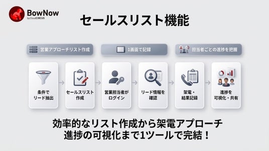 こうした課題を解消するため、BowNowは従来のマーケティング機能に加えて、営業担当者が自らツールにログインし、リストを確認しながら架電し、その結果をその場で記録できる「セールス機能」の強化に着手。営業現場の生産性向上を実現する機能として「セールスリスト」を開発いたしました。