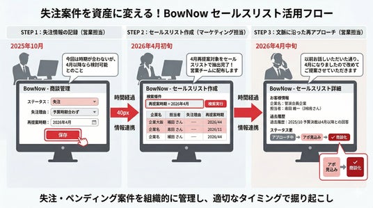・時間軸の分断:一度失注した案件や検討時期が先の顧客がそのまま放置され、