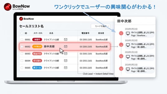 スターティアホールディングス株式会社(本社:東京都、代表取締役:本郷秀之、証券コード:3393)は、連結子会社のデジタルマーケティング事業を手掛けるクラウドサーカス株式会社(本社:東京都、代表取締役社長:金井章浩)が提供するマーケティングオートメーション(MA)ツール「BowNow(バウナウ)」において、営業活動に特化した新機能「セールスリスト」をリリースしたことをお知らせいたします。