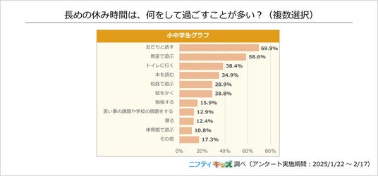 長めの休み時間には「友だちと話す」と回答した小中学生が最も多く、69.9%でした。次に多い回答は58.6%の「教室で遊ぶ」で、「トイレに行く」「本を読む」と続きます。