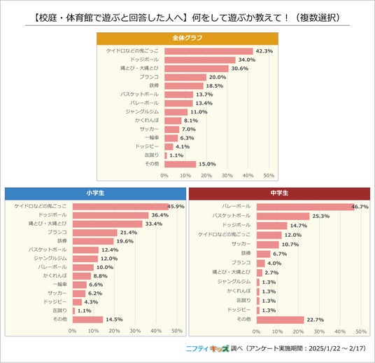 小学生では「ケイドロなどの鬼ごっこ」、中学生では2位に大きく差を付けて「バレーボール」がトップでした。