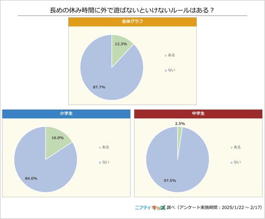 長めの休み時間に外で遊ばないといけないルールはない学校が多いようですが、小学生では16%が「ある」と回答しました。