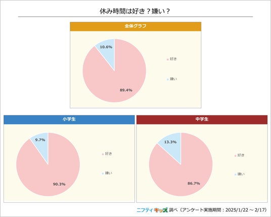 小中学生ともに、約9割が休み時間が「好き」と回答しました。「嫌い」と回答した人は、小学生が9.7%、中学生が13.3%で、中学生の方が休み時間を「嫌い」だと感じる人がやや多いようです。