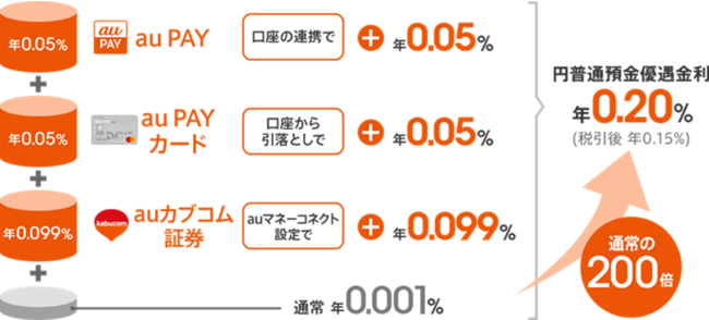 「auまとめて金利優遇」は、KDDIが提供するスマホ決済au PAY、auフィナンシャルサービスが提供するau PAY カードおよびauカブコム証券の証券口座と連携したお客さまを対象に、円普通預金の金利が最大年0.20%(税引後年0.15%)となるプログラムです。
