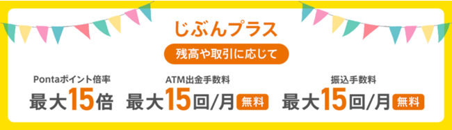 「じぶんプラス」は、各種残高やご利用状況に応じて4つのステージ(レギュラー/シルバー/ゴールド/プレミアム)ごとにPontaポイント倍率(注2)やATM利用手数料、振込手数料の無料特典を受けられるお客さま優遇制度です。