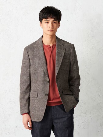 サマーウール素材を使用し、ざっくりと織られたバスッケト織の爽やかさにオレンジ系カラーがアクセントになった新鮮さのある一着で、コーディネートの差し色にオススメです。オレンジの色味にこだわり、ベージュの糸と掛け合わせることでナチュラルなトーンを実現し、オフィスカジュアルのスタイリングに取り入れやすい仕様にしました。AMFステッチや袖口の本切羽仕様など細部は高級感にこだわったデザインを取り入れました。
