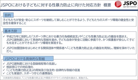 JSPOでは、この対応方針を踏まえ、子どもたちが安全・安心にスポーツを継続して楽しむことができるよう、子どもたちのスポーツ環境の健全性と安全性の確保に向け、各種対応を検討してまいります。