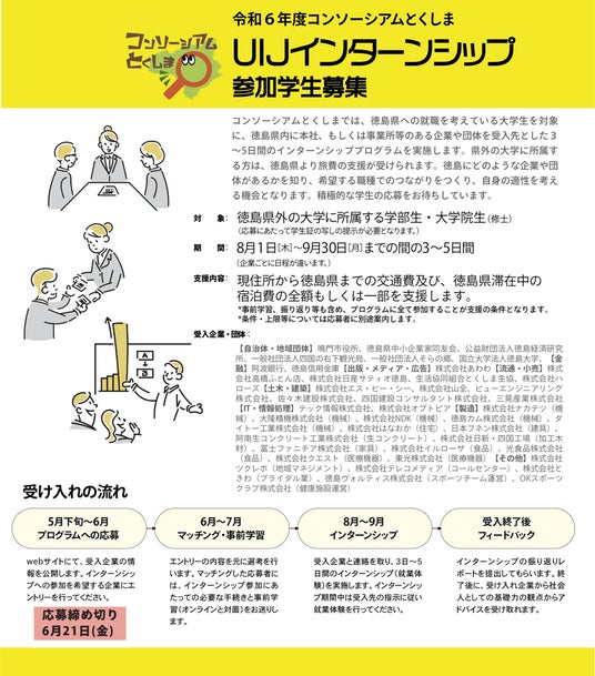 徳島県内企業への就職を考えている徳島県外の大学生・大学院生の皆様を対象に、交通費と宿泊費の支援を組み入れた5日間程度のインターンシッププログラムを実施します。