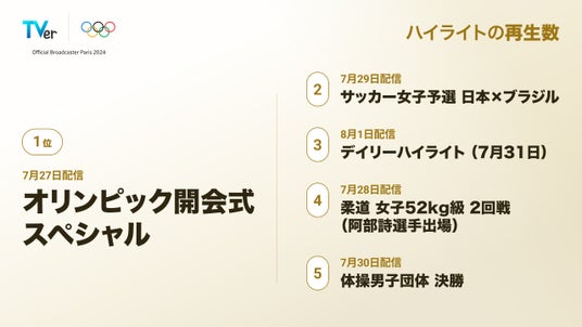 また、最もハイライトコンテンツの再生数が多かった(※8)のは7月27日配信「オリンピック開会式スペシャル」でした。次いで7月29日配信「サッカー女子予選 日本×ブラジル」、8月1日配信「デイリーハイライト(7月31日)」も再生数を伸ばしました。