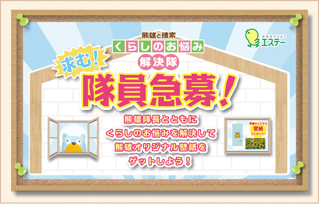 防虫剤「ムシューダ」のCMに出演しているキャラクター「ムッシュ熊雄」隊長とともに、エステー製品サイトの製品説明をヒントに、どの製品を使えば暮らしの悩みが解決できるのかを探します。クイズは全部で6問。正解した方全員に“熊雄オリジナルPC・スマートフォン壁紙”をプレゼントします。
