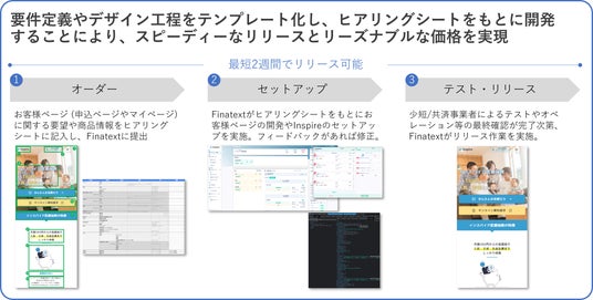 少短/共済事業者は、所定のヒアリングシートにお客様ページに関する要望や商品情報を記入し、Finatextはヒアリングシートの内容をもとに、お客様ページを開発して「Inspire」をセットアップします。ヒアリングシートの記入からシステムのリリースまで、最短2週間で実施可能です。