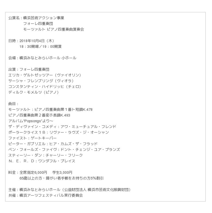 フランスの室内楽の大家、ガブリエル・フォーレの生誕150周年にあたる1995年に、ドイツ・カールスルーエ音楽大学の4人によって結成された四重奏団は、世界でも稀な常設のピアノ四重奏団で、23年間変わらぬメンバーで活動しています。かのマルタ・アルゲリッチは、フォーレ四重奏団を「誰でも必ずまた聴きたくなる」と称しており、世界屈指の最先端の音を聴かせてくれます。モーツァルトの名曲とハイセンスで楽しいポップな曲目とのカップリングを、室内楽空間として響きの美しさに定評がある横浜みなとみらいホールの小ホールで、贅沢な秋の一夜をお過ごしください。