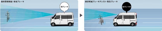 ・ステレオカメラの性能を向上させ、より広範囲な検知・認識が可能となったことで、衝突警報機能(対車両/対歩行者[昼夜])および衝突回避支援ブレーキ機能(対車両/対歩行者[昼夜])が進化