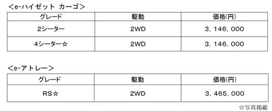 e-ハイゼット カーゴ 4シーター<オプション装着車>(左)、e-アトレー RS<オプション装着車>(右)