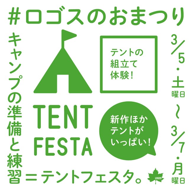 株式会社ロゴスコーポレーション(本社:大阪市住之江区、代表取締役社長:柴田茂樹)が展開するアウトドアブランドの「LOGOS」 は、春休みにキャンプにチャレンジする方々を応援するロゴスのおまつり「テントフェスタ」を2022年3月5日(土)から3月7日(月)まで実施いたします。