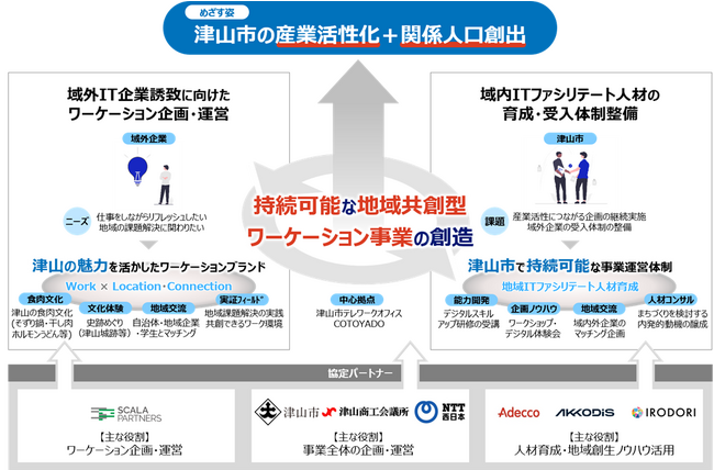 岡山県津山市(市長:谷口 圭三 以下、「津山市」)と津山商工会議所(会頭:松田 欣也 以下、「商工会議所」)、西日本電信電話株式会社 岡山支店(支店長:西川 智洋 以下、「NTT西日本」)、アデコ株式会社(代表取締役社長:川崎 健一郎 以下、「アデコ」)、AKKODiSコンサルティング株式会社(代表取締役社長:川崎 健一郎 以下、「AKKODiSコンサルティング」)、株式会社IRODORI(代表取締役社長:谷津 孝啓、以下「IRODORI」)、株式会社スカラパートナーズ (代表取締役社長:梛野 憲克 以下、「スカラパートナーズ」)の7者は、津山市の産業活性化と関係人口の創出をめざし、連携協定を締結します。