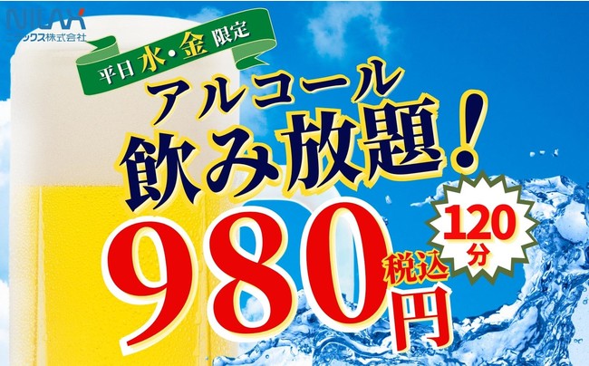 この度、平日水曜日と金曜日だけの特別プラン!生ビールや、ハイボール、レモンサワーなど、26種類のアルコールが120分980円(税込)の飲み放題で登場いたしました!