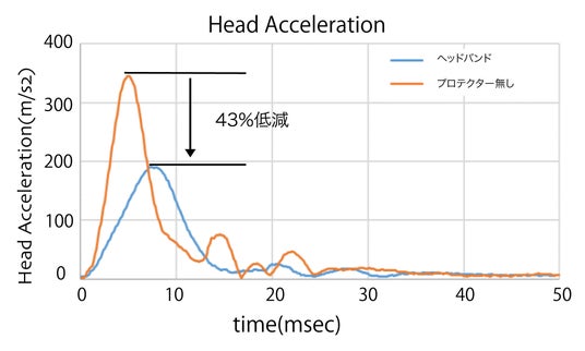 転倒や衝突時の頭部傷害(中等症)の発生リスクを45%、頭部への衝撃は43%低減