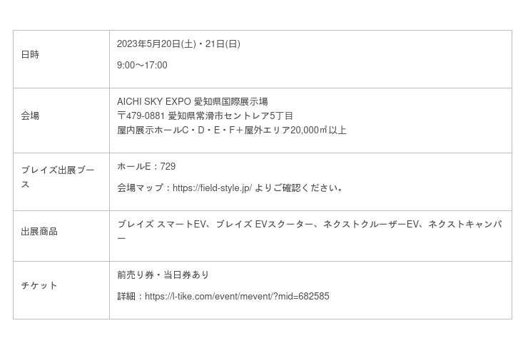 株式会社ブレイズ(愛知県名古屋市、代表取締役:市川秀幸、以下ブレイズ)は、2023年5月20日(土)・21日(日)に「AICHI SKY EXPO 愛知県国際展示場」にて開催される「FIELDSTYLE JAPAN 2023」に出展することお知らせします。