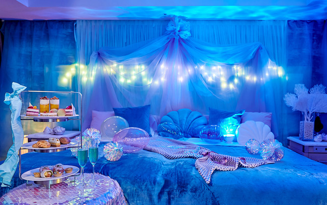 さらに、ブランケットや貝殻のクッションなどのアイテムを揃え、まるで海の中にいるかのような空間で、人魚姫になった気分を味わいながら、フォトジェニックな写真撮影をお楽しみいただけます。暗くしたお部屋では、天井にコバルトブルーに染まる海の神秘的な世界が映りこみ、昼間とは異なる雰囲気を体感いただけます。
