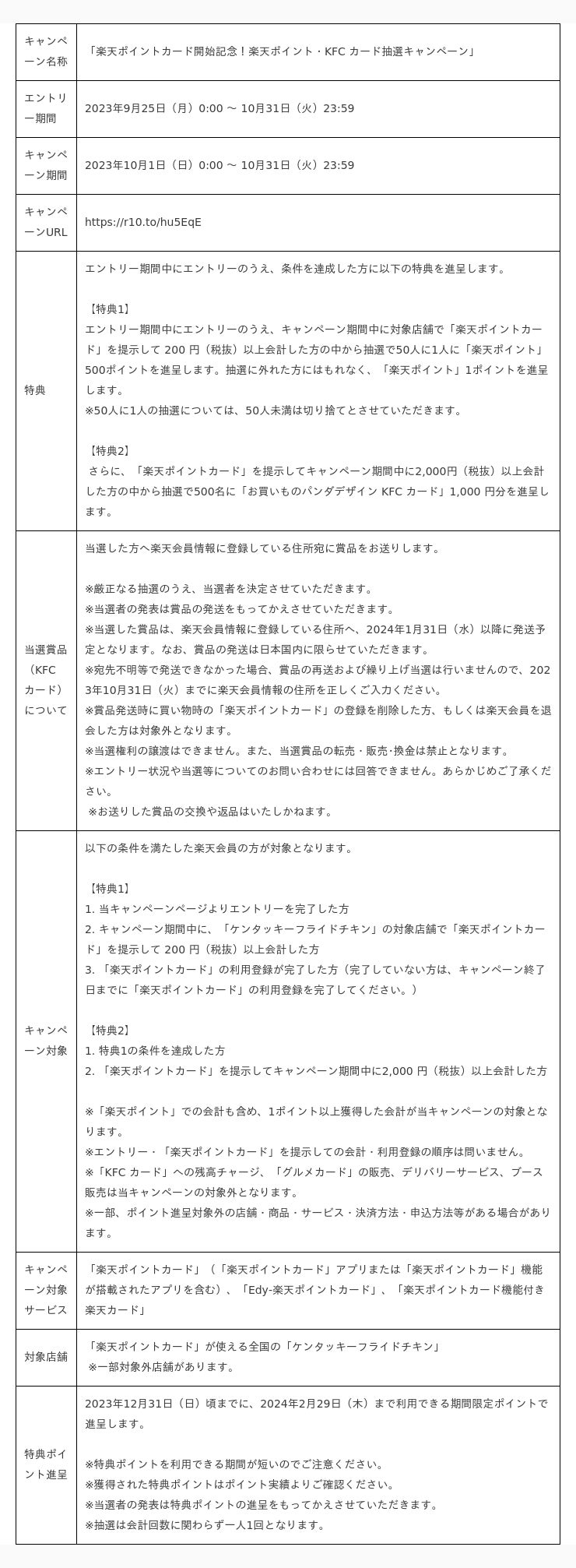 - 「楽天ポイントカード開始記念!楽天ポイント・KFC カード抽選キャンペーン」を実施 ‐
