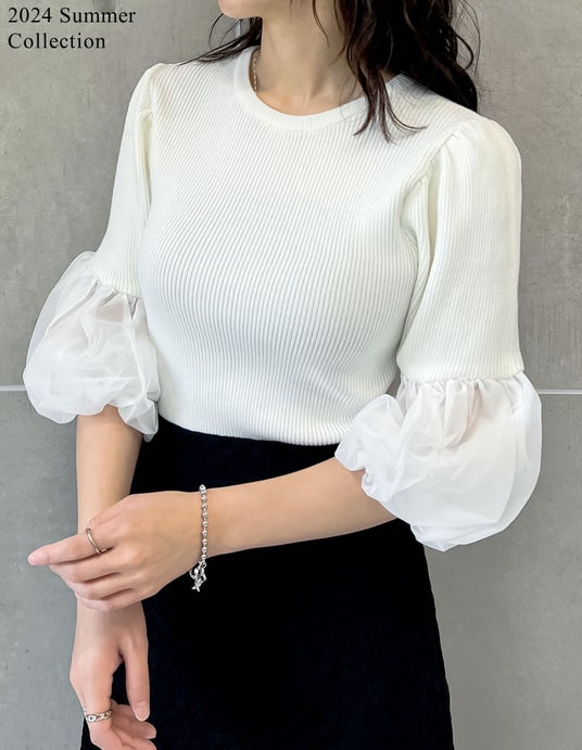 [お洒落に二の腕隠し]異素材切り替えバルーンスリーブ七分袖リブニットトップス