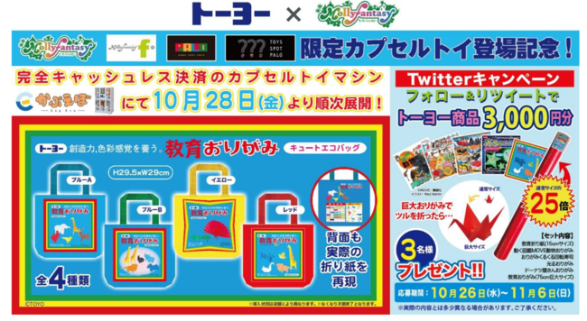 株式会社イオンファンタジー(本社:千葉県千葉市、代表取締役社長:藤原徳也、以下、当社)は、「トーヨー教育おりがみ キュートエコバッグ」を、アミューズメント施設「モーリーファンタジー」「PALO」、カプセルトイ専門店「TOYS SPOT PALO」などに設置する当社オリジナル完全キャッシュレスカプセルトイマシン「かぷえぼ」限定のカプセルトイとして10月28日(金)より順次展開いたします。