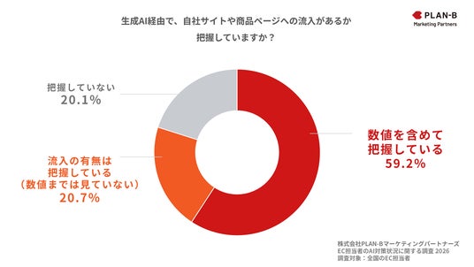 まず、「生成AI経由の自社サイト・商品ページへの流入の有無を把握しているか」について尋ねたところ、「数値を含めて把握している」59.2%と回答し、「流入の有無は把握している(数値までは見ていない)」20.7%と合わせると、約8割のEC担当者がすでに生成AI経由の流入の有無を確認していることがわかりました。一方で、約2割はまだ把握できておらず、対応状況には差が見られます。