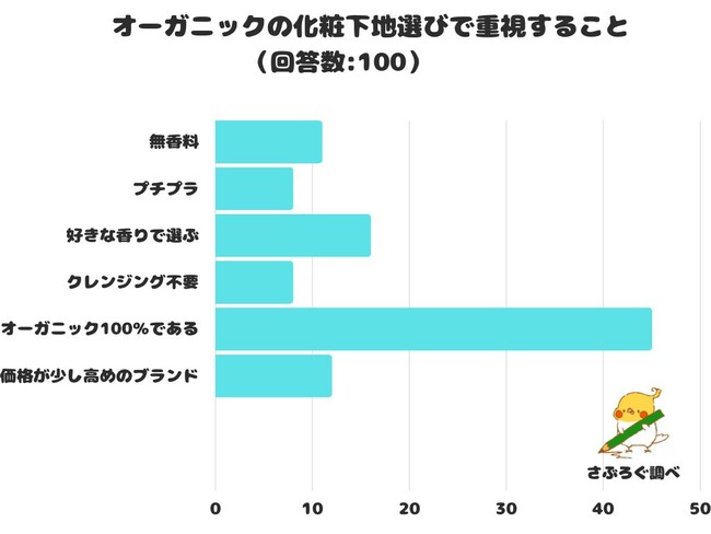 オーガニックの化粧下地選びで重視することをアンケートにて調査したところ、1位は「オーガニック100%である」でした。