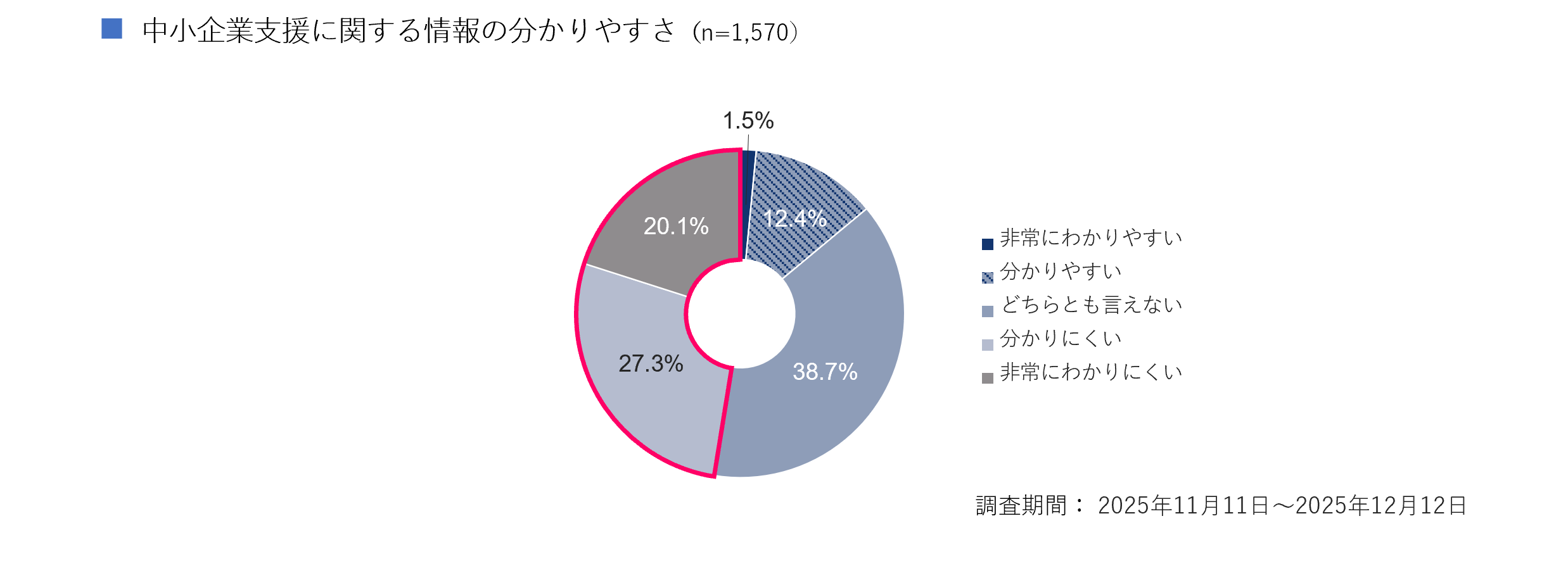 一方で、「非常に分かりにくい」の20.1%、「分かりにくい」の27.3%の合計は47.4%という結果になった。これらの結果から、中小企業支援に関する情報は、中小企業にとって分かりにくいことが示された。