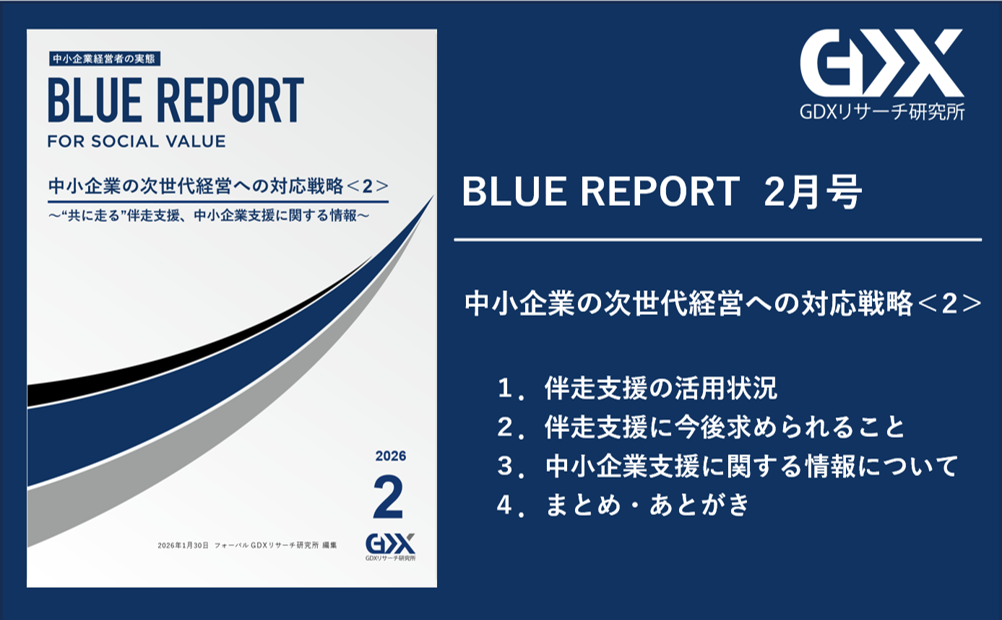 『「新しいあたりまえ」で、新しい世界を創るFORVAL』を理念に掲げる、次世代経営コンサルタント集団である株式会社フォーバル(本社:東京都渋谷区、代表取締役社長:中島 將典、以下「フォーバル」)が運営するフォーバル GDXリサーチ研究所は、中小企業向けの様々な支援に関する認知・理解状況や活用実態などについて調査した「BLUE REPORT 2月号」を2026年1月30日(金)に発行いたします。